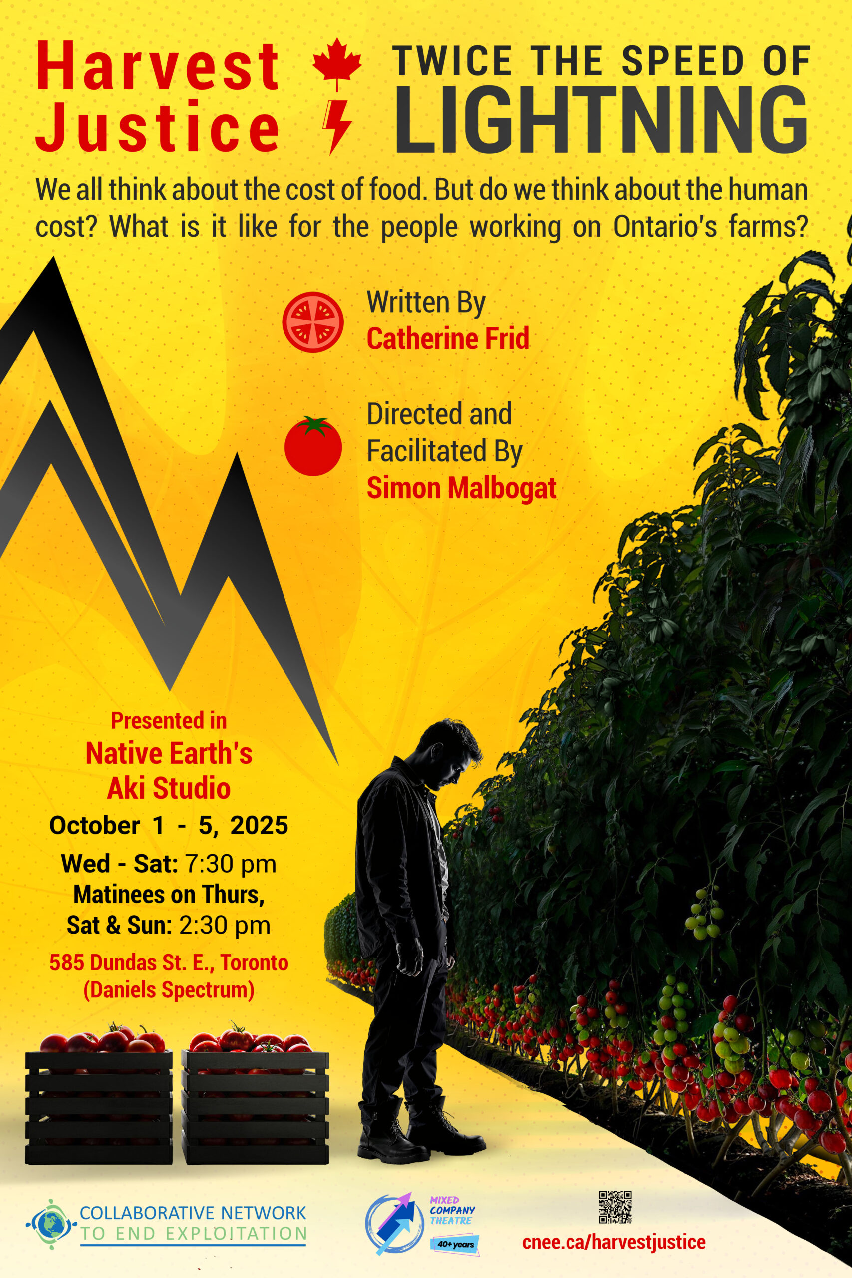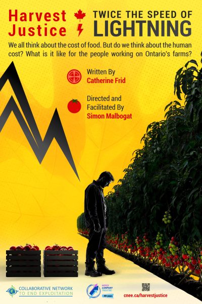 TORONTO – September 2025 – The Collaborative Network to End Exploitation (CNEE) and Mixed Company Theatre (MCT) have partnered to present Harvest Justice: Twice the Speed of Lightning (TSOL), an interactive production that shares the stories of migrant workers in Canada. The production aims to build solidarity and empower audiences to take actions for a fairer and more equitable Canada for all.